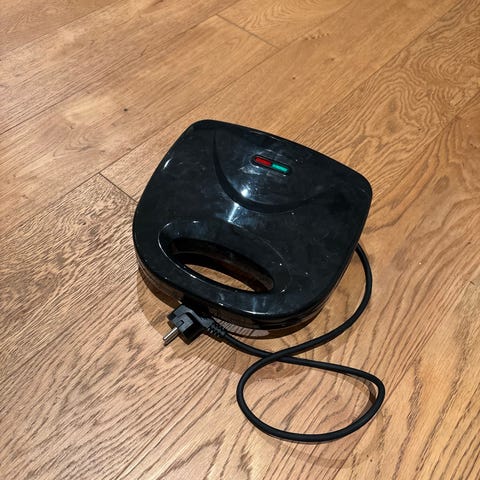 Sort smørbrødgrill med dobbel plate for to smørbrød samtidig. Kompakt design med håndtak og indikatorlys for enkel bruk.