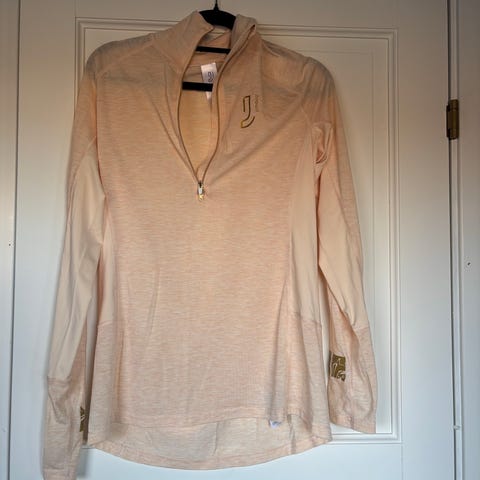 Johaug Merinoull ullundertøy i størrelse M for kvinner. Laget av 100 % merinoull, designet for å gi varme ved lav til middels intensitet trening. Fargen er grå med detaljer i beige på ryggen og under armene.