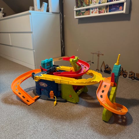 Bilbane med 2 biler. Delen med bakke er limt, se bilde.