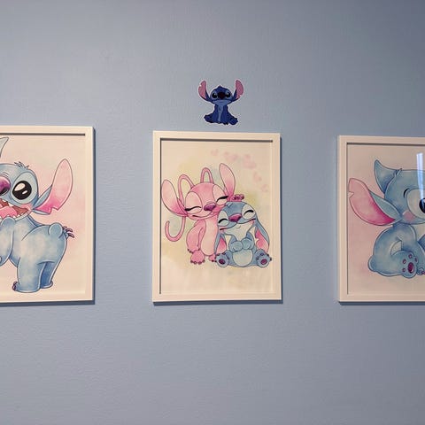 Disney Stitch innrammet plakat med svart ramme. Motiv av karakteren Stitch med glødende effekter på mørk bakgrunn.