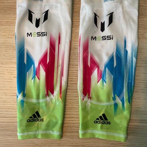 Adidas Messi fotballstrømper med grønn, hvit og flerfarget design. Strømpene har et mønster med blå, røde og oransje detaljer. Egnet for bruk under fotballtrening og kamper.