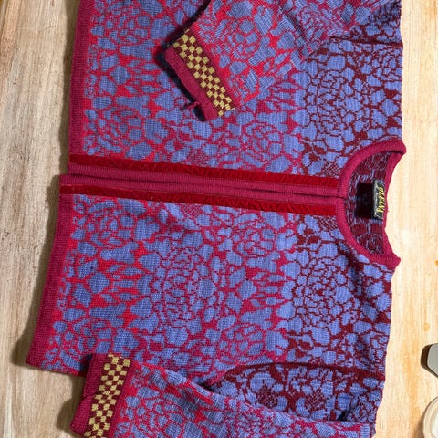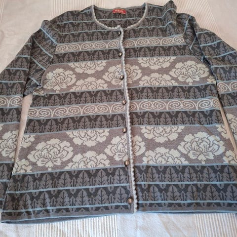 Nydelig lys Oleanajakke i 75 % merinoull oh 25 % silke. Aldri brukt, bare prøvd på. Tags er dessverre fjernet.