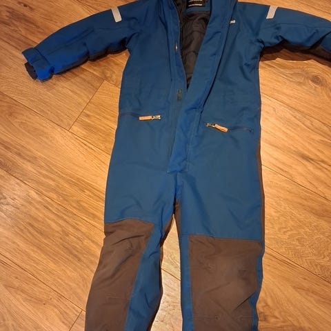 Tykk og varm vinterdress med god kvalitet selges. Bruksmerker: lett fargeslitasje og et lite hull på det ene kneet (se bilde). Mangler fotstropper.