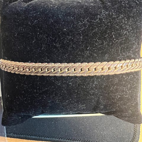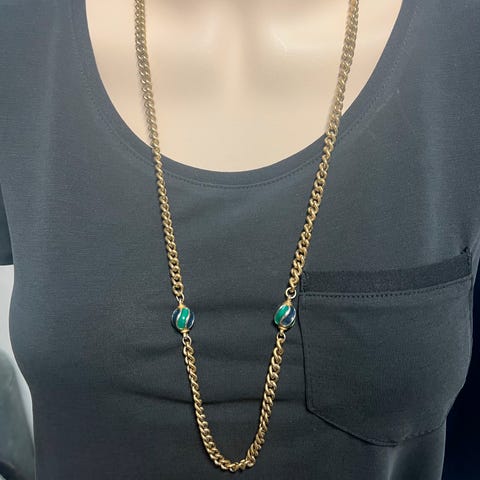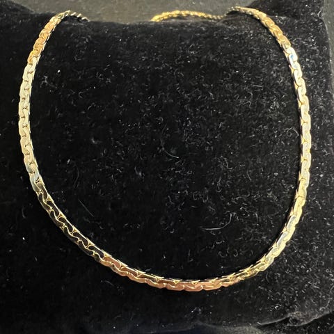 Selger et brukt halskjede på 80 cm, ingen stempler eller navn. Litt mørkt gullfarget.