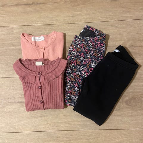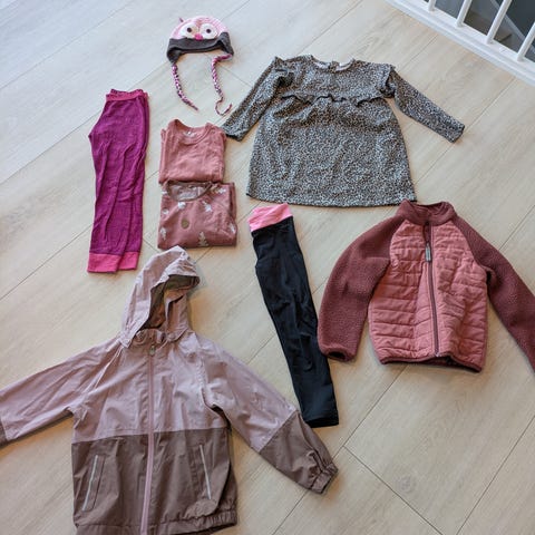 Bitteliten klespakke til jente i størrelse 110. Settet inkluderer en flerfarget hettejakke med mønster, en nesten ubrukt Newbie kjole, og et par grå nesten ubrukt bukser.