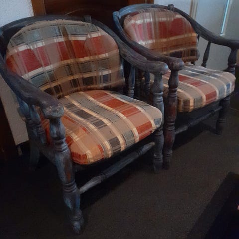 Har 2 stk gamle stoler,heltre og trukket om! En er pusset fôr eventuelt male,eller velge ha sånn! De er ikke vinglete,men hele og fine. Gode sitte på,og sete er enkelt løfte opp,vis man vil trekke om!