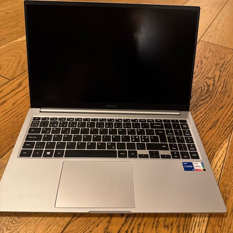 Samsung Galaxy Book4 bærbar PC med 15,6 tommers skjerm, 512 GB lagringskapasitet, og IPS-skjermteknologi. Laptopen er designet for generell bruk og har en grå overflate.