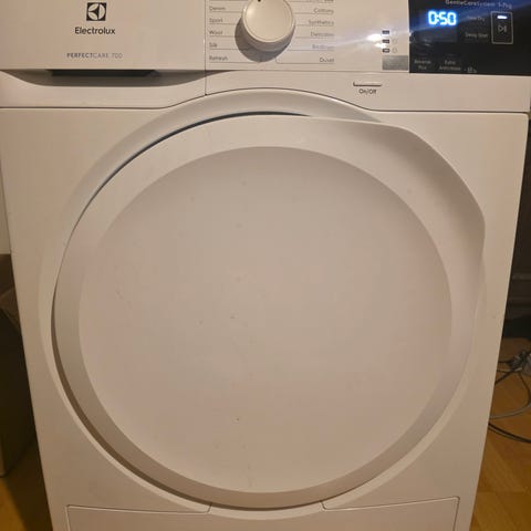 Electrolux kondens tørketrommel. Hvitt design med frontåpning og kontrollpanel med dreiebryter og digital skjerm. Egnet for kondensbasert tørking av klær.