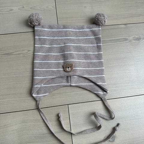 Grå kivat lue str 0 (0-1 år) med knyting. Ingen merker. Som ny.
