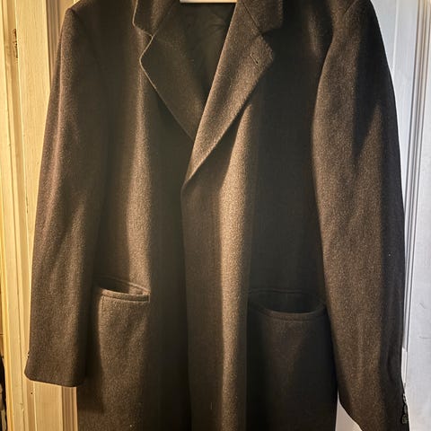 Selger en mørkeblå ullfrakk, LLoyd’s business class. Innvelg er den pent foret og med lomme. Frakken har splitt og sidelommer.