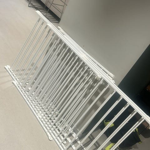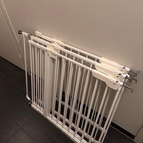 Trappegrind/ sikkerhetsgrind i stål, hvit farge.Passer til dører og trapper. Kan betjenes med en hånd. Maks. bredde 105 cm. B67-105 x H70 x D4 cm Originalt oppheng og skruer følger med. Må hentes.
