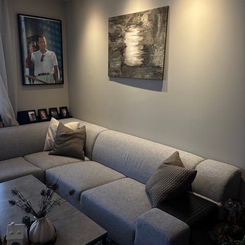 Kjøpt brukt i 2023 for 10 000 kr. Sofaen er pent brukt og i god stand, men har normal bruksslitasje. Noe gulning i stoffet, særlig i direkte sollys – kan trolig forbedres med rens. Ingen hull eller strukturelle skader.