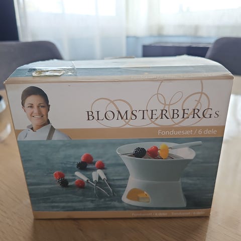 IKEA Sjokolade Fondue med kapasitet på 5 dl, laget av keramikk og stål. Settet inkluderer 4 gafler. Egnet for å smelte sjokolade med eller uten melk, med anbefaling om å unngå klumper.