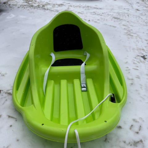 Rattkjelke i rød og svart farge med sete og styresystem. Kjelken har en bred sittedel med polstret sete, ratt for styring og skinner for stabilitet. Egnet for bruk på snøflater for barn og voksne.