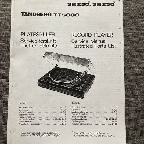 Meget god kopi av serviceforskrift og deleliste til platespillerne Tandberg TT 5000, Radionette Gram 5000, samt Soundmaster 250 og 230. Den er på i alt 15 sider, med norsk og engelsk tekst.