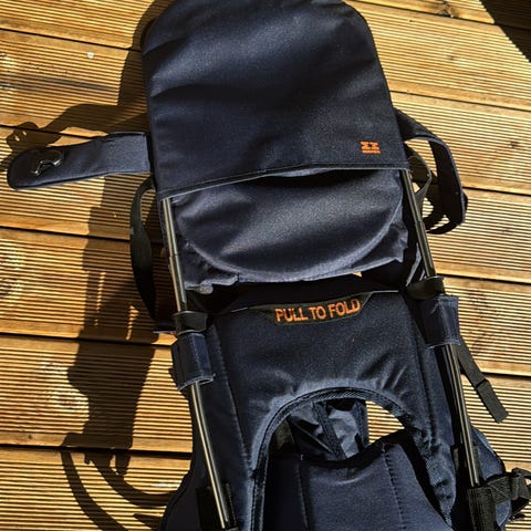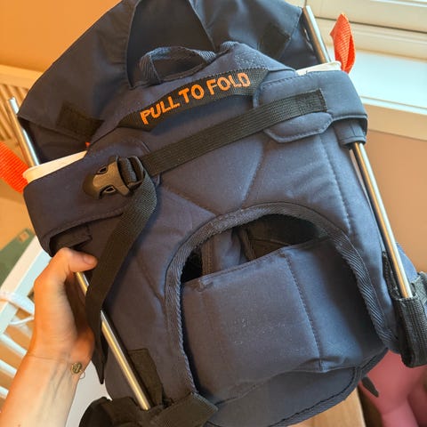 Den blir en fin skulderveske når den ikke er i bruk. Og er meget praktisk å ha med seg. Vi har alltid hatt den i bilen, og den får plass i en hvilken som helst koffert, evt i barnevogn.