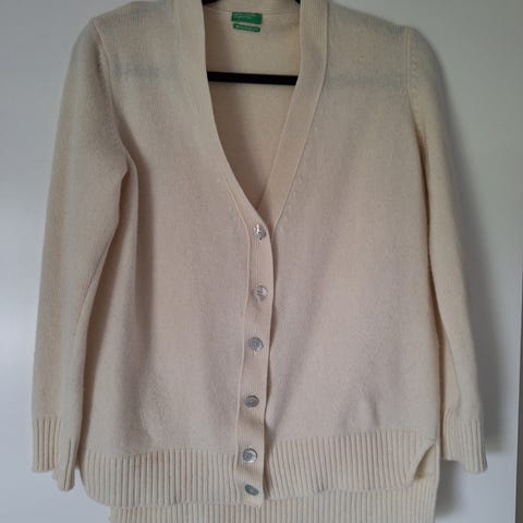 Selger en superfin Benetton genserkjole i 80% ull. Lys fin beige farge. Veldig fint snitt, med en kledelig «båthals», ingen hull. Størrelse M. Pris 260kr.