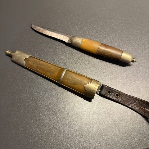 Tommeliten tinnkniv med etui