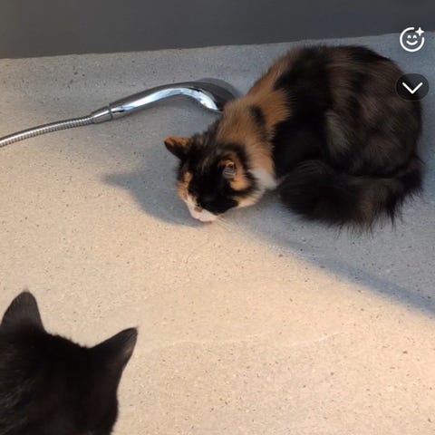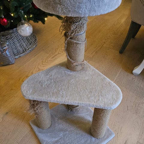 Kattestativ med klorestolpe, hule og hengende leke. Stativet er dekket med blått stoff og har en beige huleinngang. Passer for katter som trenger kloremuligheter og et sted å hvile. Katter brukte litt