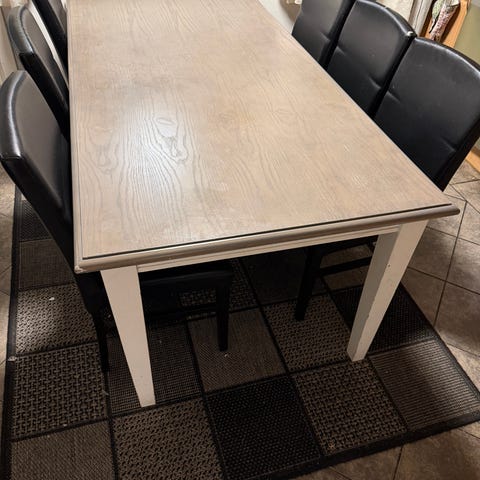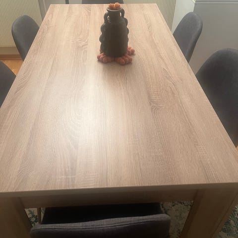 Spisebord og 6 stoler - 8 år gammelt, men lite brukt og derfor moderat slitasje. Følger med to ileggsplater som er 50 cm brede hver. Må hentes i Lørenskog. Bordbein blir demontert før henting.