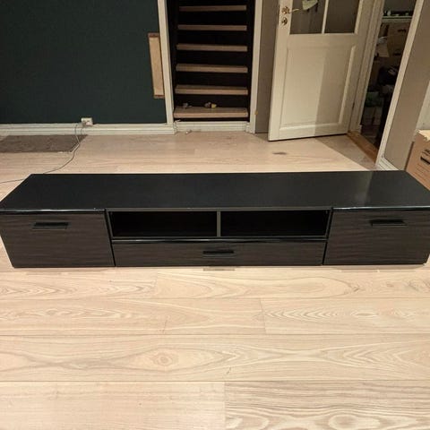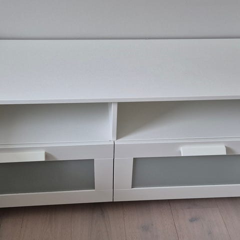 Hvit tv-benk med tre skuffer. Utskjæringer i treverket på sidene. Solid møbel med knotter i metall. Noen striper på bordplaten, men ikke veldig synlige når man har en tv osv. oppå platen.