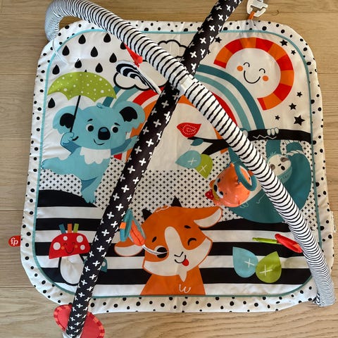 Fisher-Price babygym og babysitter med fargerikt mønster. Babygymmen har myk matte med hengende leker, og babysitteren har justerbar ryggstøtte og sikkerhetssele. Passer for små barn og bidrar til motorisk utvikling og avslapning.