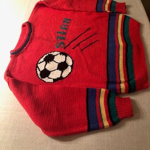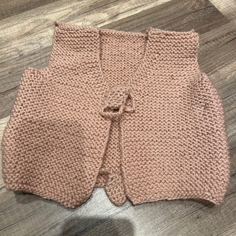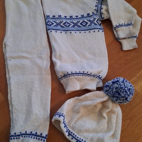 Barnegenser til jente som heter Carina, ettersom navnet er strikket inn i mønsteret på genseren. Regner med at den passer ei jente på 3-4 år. Lengde fra skulder og ned er 35 cm, ermet har lengde 24 cm. Hvis den må sendes i posten, må kjøper betale for frakten.