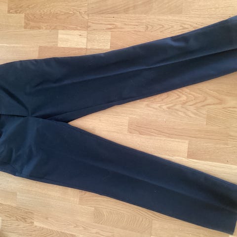 Sort klassisk dressbukse i smal modell, brukt av én ungdom. 45 % ull i stoffet. De selger samme bukse nå, men denne er 3 år gammel og derfor noe annerledes på innsiden.