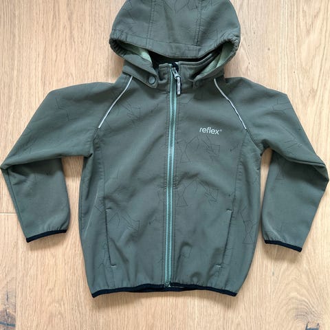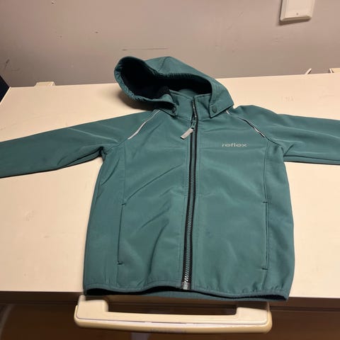 Reflex Softshelljakke for barn i størrelse 116. Jakken er blå og laget av polyester. Den er designet for unisex bruk og har hette samt glidelåslommer. Reflekser på ermer bidrar til økt synlighet. Pent brukt!