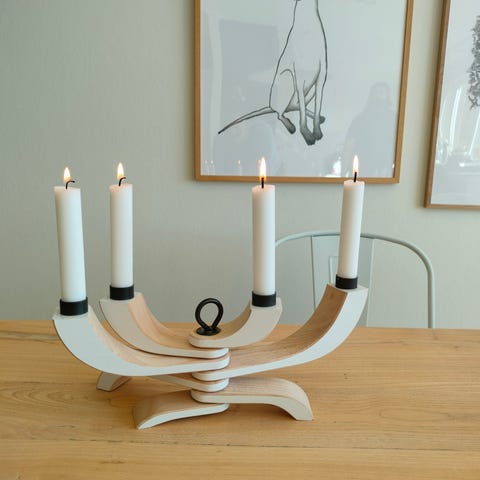 Selger en elegant og skulpturell adventsstake i massivt tre, med plass til 7 lys. Staken har et tydelig nordisk formspråk med buede armer og lagdelte detaljer, og fremstår som et lite designobjekt i seg selv.