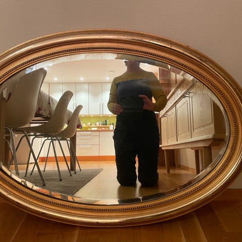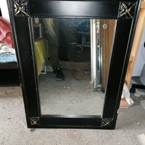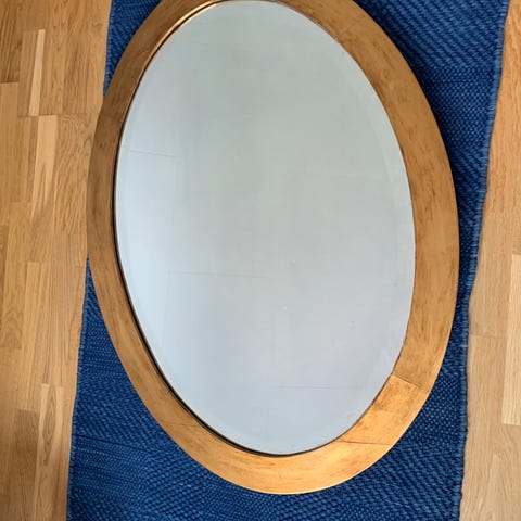 Oval form: lengste side 72 cm og korteste side 62 cm. Har oppheng på bakside. Speilet er gammelt, og selve speilflaten har svake krakeleringer. På den ene siden av gullrammen er det en krakelring.