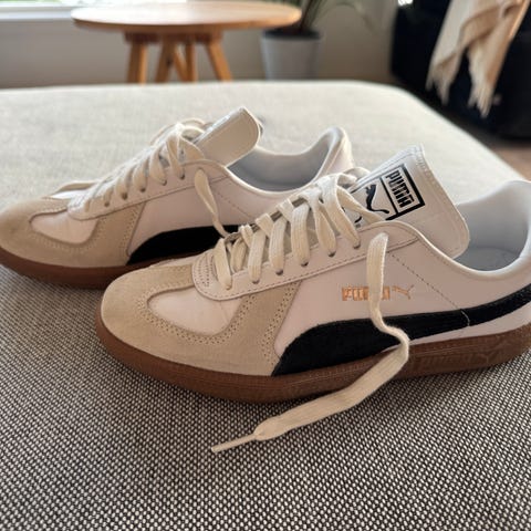Disse kjempe kule og stylish hvite med masse rød og gull detaljerte skoene selges i størrelse 40,5 og kan brukes av både jenter og gutter om ønsket.