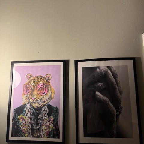 Sett med 4 kunsttrykk med gullfargede motiver på svart bakgrunn. Rammene er i gullfarge. Passer til veggdekorasjon i hjem eller kontor. Bildene er 36,5*35 cm. Motivene er fra gresk mytologi: Hemera, Areion, Ilya og Tithonos. Stilen minner feks om Jonathan Adler. Alle har tråd for oppheng på baksiden.