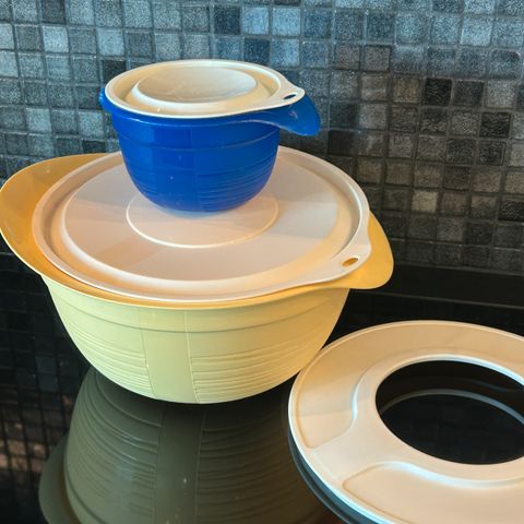 Selger 3 Tupperware bakeboller. Følger med lokk til de to minste, men mangler lokk til den største (den oransje) . Alt er ubrukt og i plastikk.