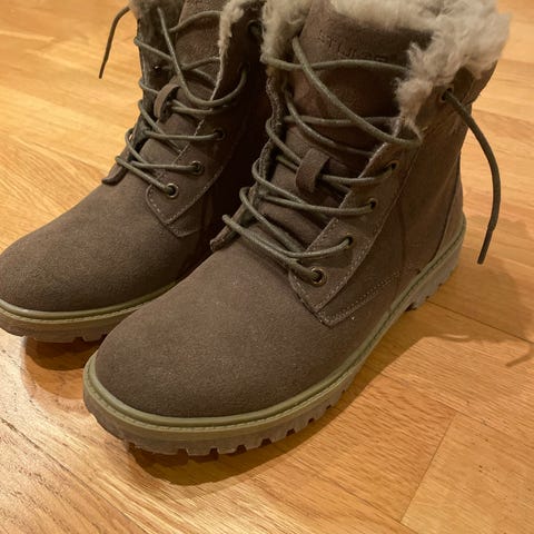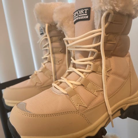 Vinterstøvler i størrelse 37 for dame i beige farge. Støvlene har snøring og er foret med mykt, hvitt materiale for isolasjon og komfort. Sålen er laget av gummi for godt grep. Egnet for kaldt vær.