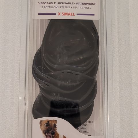 Basic potesokker i fleece med gummisåle. De er i str xs og passer til de miste hundene. Vår hund har prøvd dem på innendørs, men de passet ikke. Han er en Jack russell.