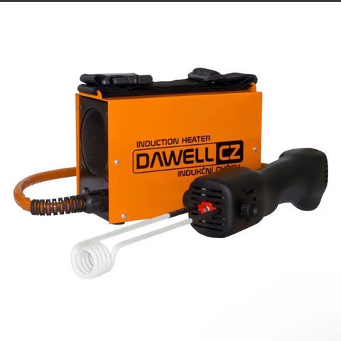 Dawell CZ induksjonsvarmer med bærbar design og tilhørende tilbehør. Enheten er oransje med svart håndtak og leveres med en solid bæreveske. Egnet for oppvarming ved industrielle eller tekniske formål.