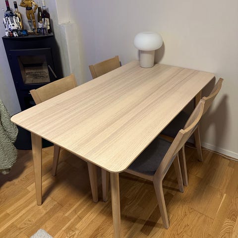 Stort spisebord med hvit overflate og bein av lys eik. Medfølger 8 stoler og tilleggsplater til bordet 45 cm × 2. Må hentes. Noen få bruksmerker, men i relativt god stand. Veldig stødig bord og stoler.