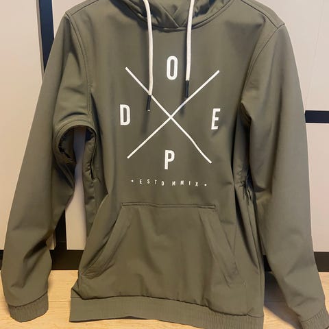 Dope Hettegenser for menn i størrelse M. Genseren er turkis og laget for sportstype ski. Den har hette og frontlomme(liten flekk der).