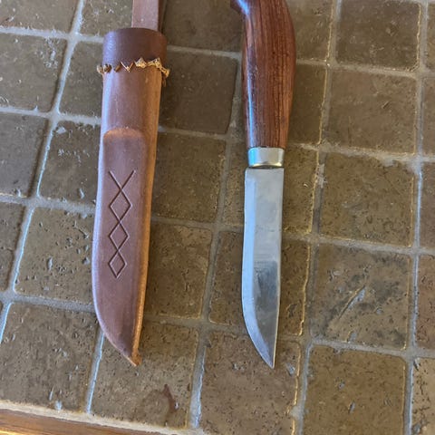 Busletto kniv med blad i rustfritt stål, trehåndtak og medfølgende lærslire. Egnet for utendørs bruk og generell knivbruk.