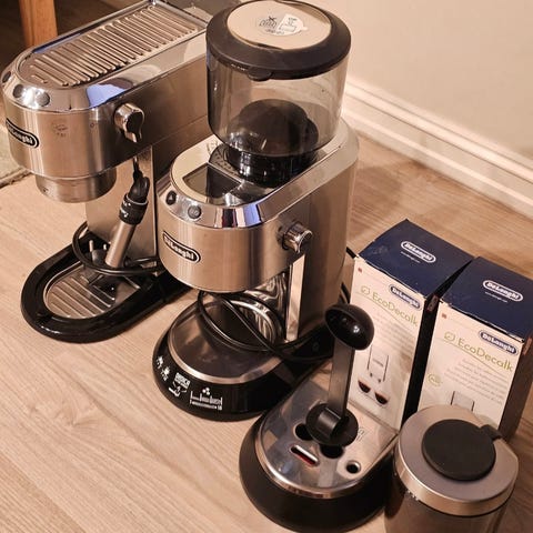 Sage The Barista Express Espressomaskin BES875 i rustfritt stål. Utstyrt med innebygd kaffekvern, trykkmåler, og dampstav for melkeskumming. Designet for å lage espresso, americano og melkebaserte kaffedrikker hjemme.
