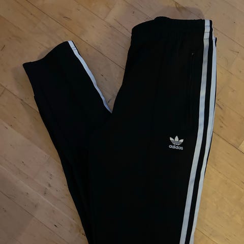 Adidas treningsbukse for dame i størrelse S. Buksen er svart med rosa detaljer og har Aeroready teknologi for fukttransport. Passer til ulike typer trening. Glidelås i lommer og nederst på sidene. Så godt som ny. Selges kr 300,-(64)
