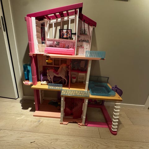 Pent brukt barbiehus som kan lekes med lenge 😍 Jenta vår bruker det ikke lengre så hun vil selge det. Det er tapet i 2 etasje, men har ingenting å si for bruken. Den svarte teipen er for å holde det sammen da det egt er i 3 deler