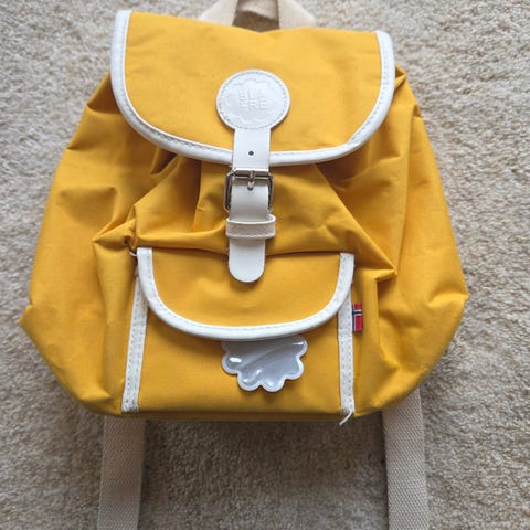 Hel og fin Blafre tursekk. Gul med lysblå reimer. Ett par små flekker på den(se bilde) , ikke prøvd å vaske, men eller hel og pen , ingen slitasje, lite brukt.