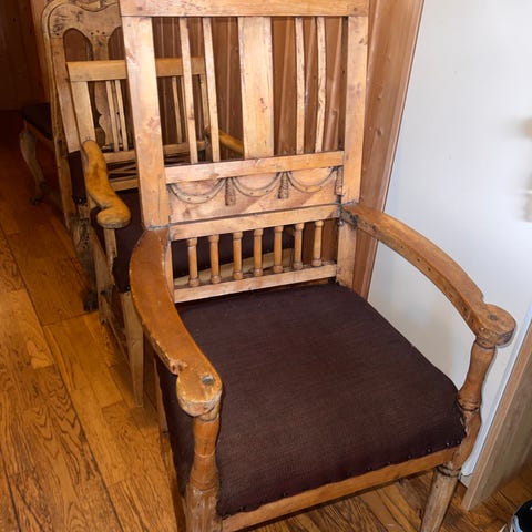Stolpar antikke trestoler med utskjæringer. To stoler i heltre med dekorative utskjæringer i rygg og armlener. Stolene har høy rygg og armlener, og fremstår ubehandlet eller med slitt overflate som egner seg for restaurering eller videre behandling. Passer som sittemøbler eller som dekorative innredningselementer i hjem, hytte eller lignende miljøer. Må skjæres ferdig