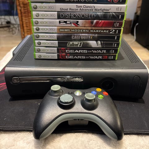 Sony Playstation 4 spillkonsoll med to trådløse kontrollere i blått og svart. Alt funker fint