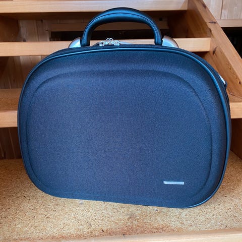 Selger en sminkekoffert i sort. Den har god plass til sminke og tilbehør, samt skulderstropp.