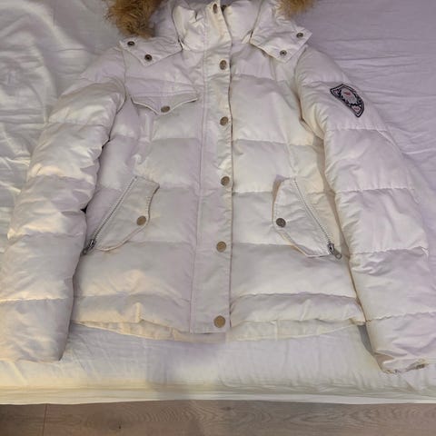 Superdry Vinterjakke i størrelse XS for kvinner. Jakken er hvit og laget av polyester. Den har hette med pelsdetalj (hetten kan bli tatt av hvisønsket) og flere lommer med glidelås.