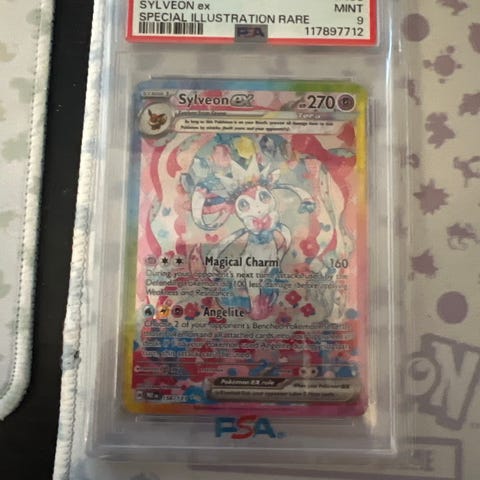 Pokémon Eevee VMAX trading card fra 2021. Kortet er innkapslet og vurdert av PSA med vurdering 9.