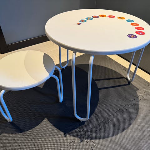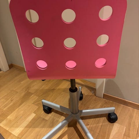 IKEA barnestol med rosa sete og ryggstøtte, utstyrt med hullmønster. Stolen har et justerbart understell med hjul, som gir mobilitet og fleksibilitet i bruk.